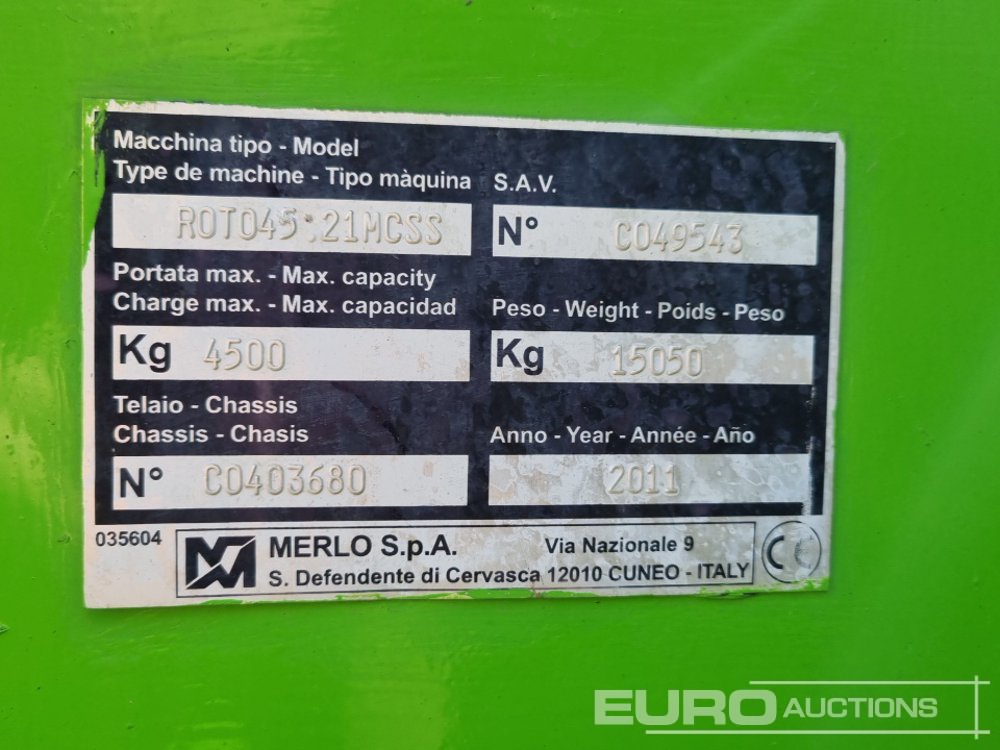 2011 Merlo 45.21MCSS Turbo Roto Telehandler, Joystick Controls, Sway, Stabilisers, WLI, Forks, Crane Attachment, Crane Jib, Hydraulic Tilting Man Basket (Reg. Docs. Available) - WL60 RBV - C0403680