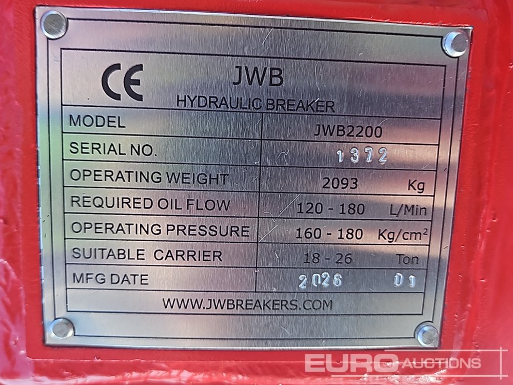 Unused 2026 JWB JWB2200 Hydraulic Breaker 80mm Pin to suit 20 Ton Excavator - CY811372