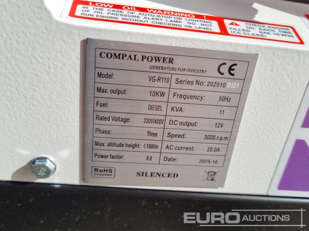Unused 2025 Compal Power VG-R110 11kVA Generator, 1 Cylinder Engine - 2025100131
