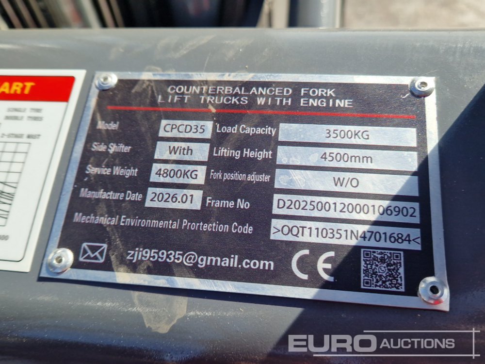 Unused 2026 HCHI CPCD35 3.5 Ton Diesel Forklift, 3 Stage Free Mast Lift, Side Shift, Forks - D20250012000106902