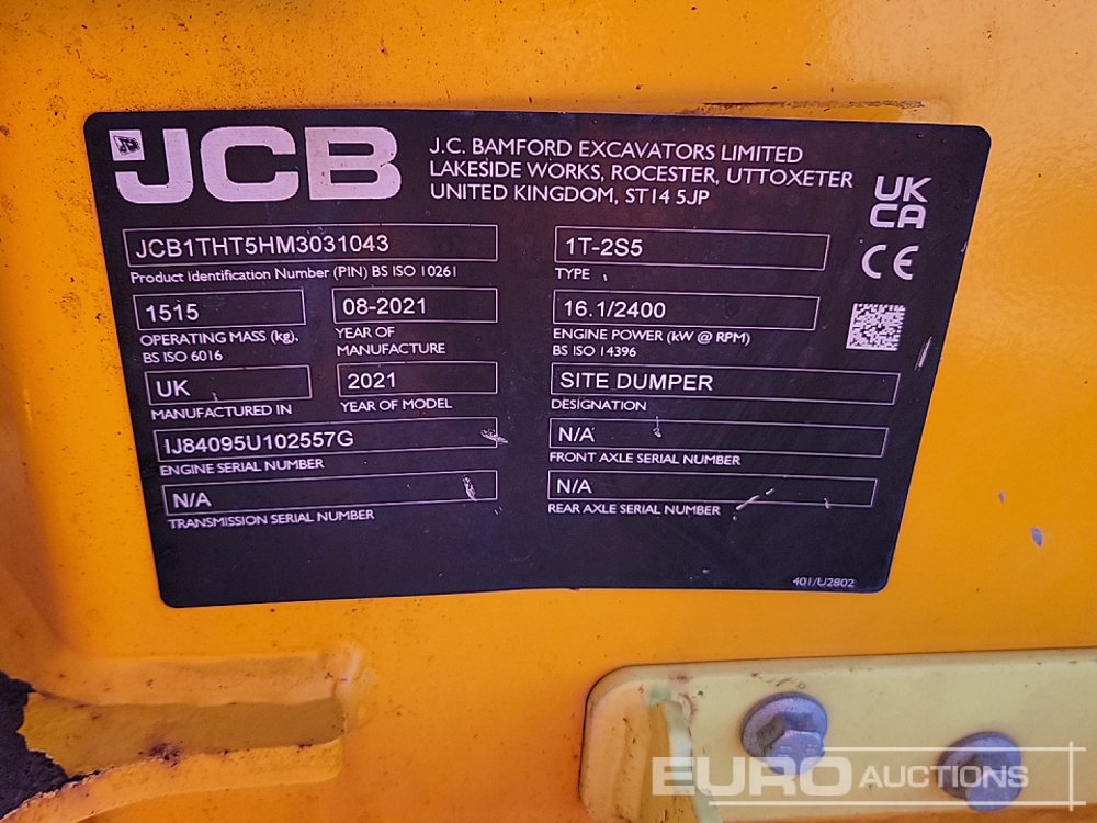2021 JCB 1T-2S5 1 Ton Hi Tip Dumper, Roll Bar (Certificate of Conformity Available) (Meter Reading: 553 Hours) - JCB1THT5HM3031043