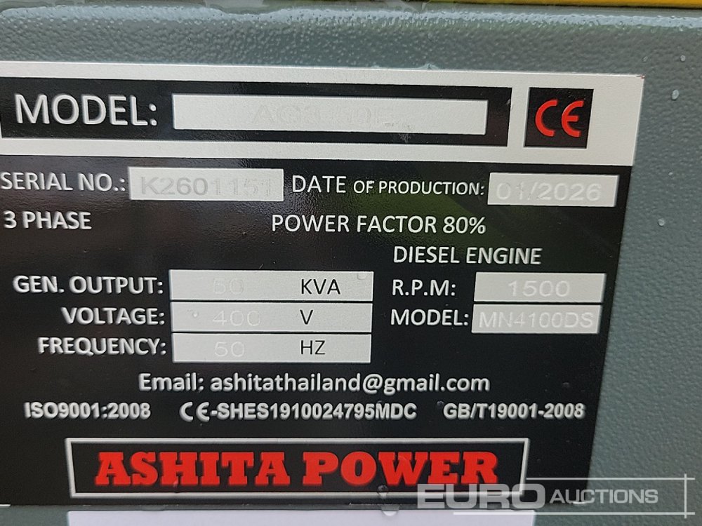 Unused 2026 Ashita Power AG3-50E 50kVA Generator, 4 Cylinder Engine - K2601151
