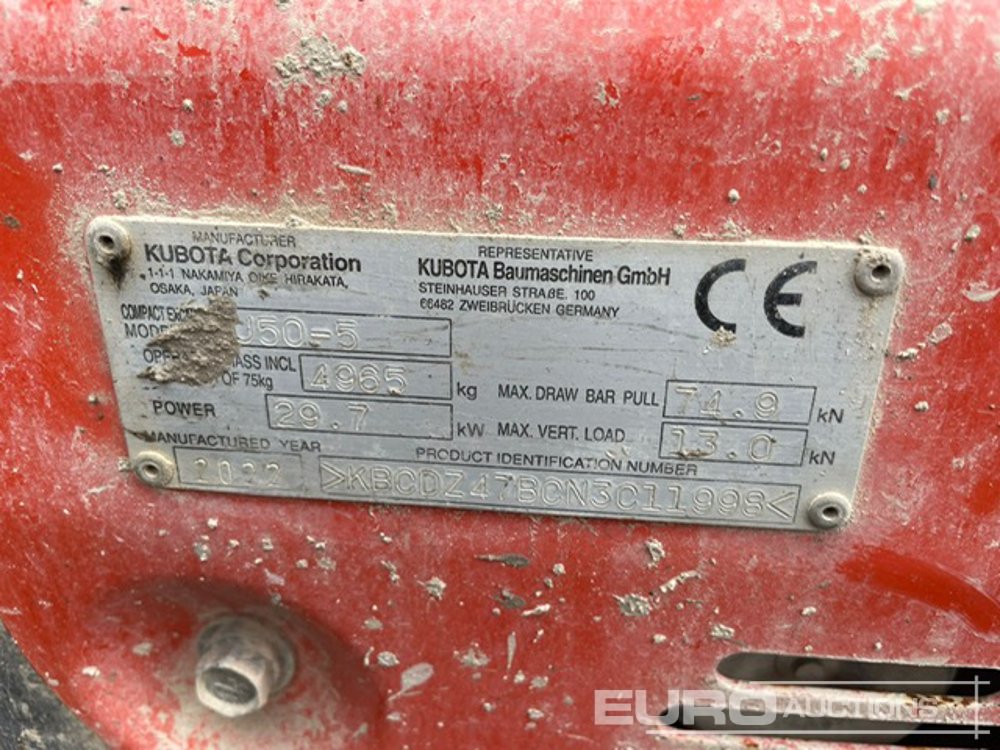 2022 Kubota U50-5 Rubber Tracks, Blade, Offset, CV, Piped, Aux. Piping, Reverse Camera, A/C - KBCDZ47BCN3C11998