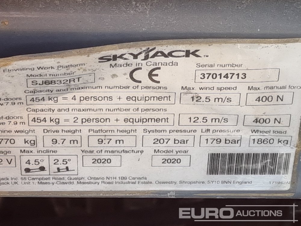 2020 SkyJack SJ6832RT 4x4 Diesel Scissor Lift, 11.7m Working Height, 454kg Platform Capacity, Power To Platform, Extending Deck, Stabilisers (Meter Reading: 791 Hours) - 37014713