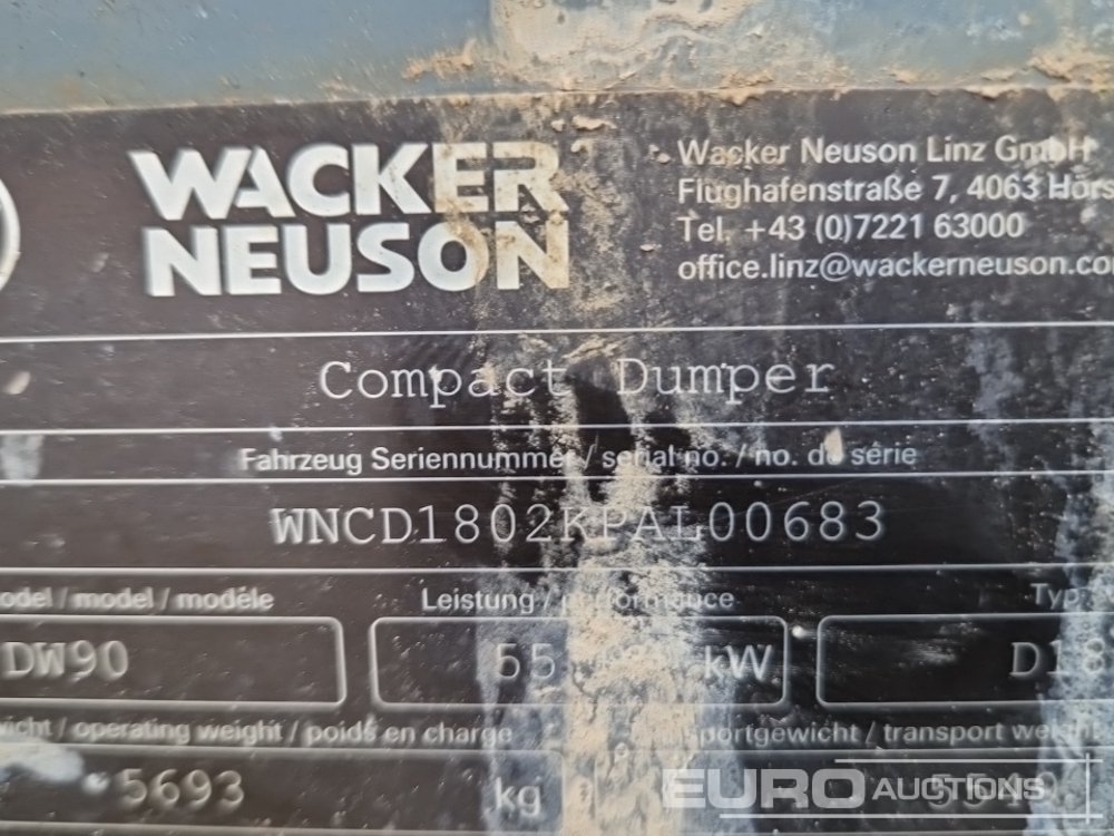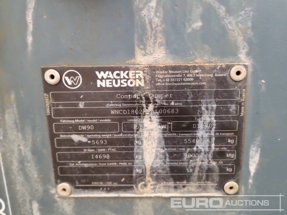 2018 Wacker Neuson DW90 9 Ton Swivel Skip Dumper, Roll Bar - BT18 KOD - WNCD1802KPAL00683