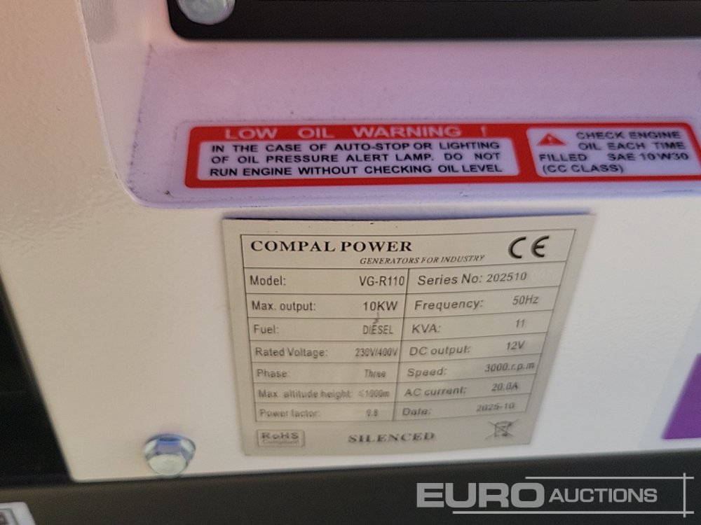 Unused 2025 Compal Power VG-R110 11kVA Generator, 1 Cylinder Engine - 2025100078