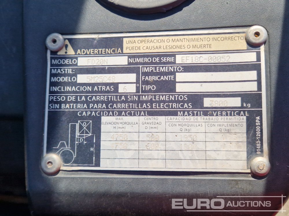 2004 Mitsubishi FD20 2 Ton Diesel Forklift, 3 Stage Free Mast Lift, Side Shift, Foks (Spanish Reg Docs and Declaration of Conformity Available / Documentación Española y CE Disponible) - E1934BCT - EF18C00052