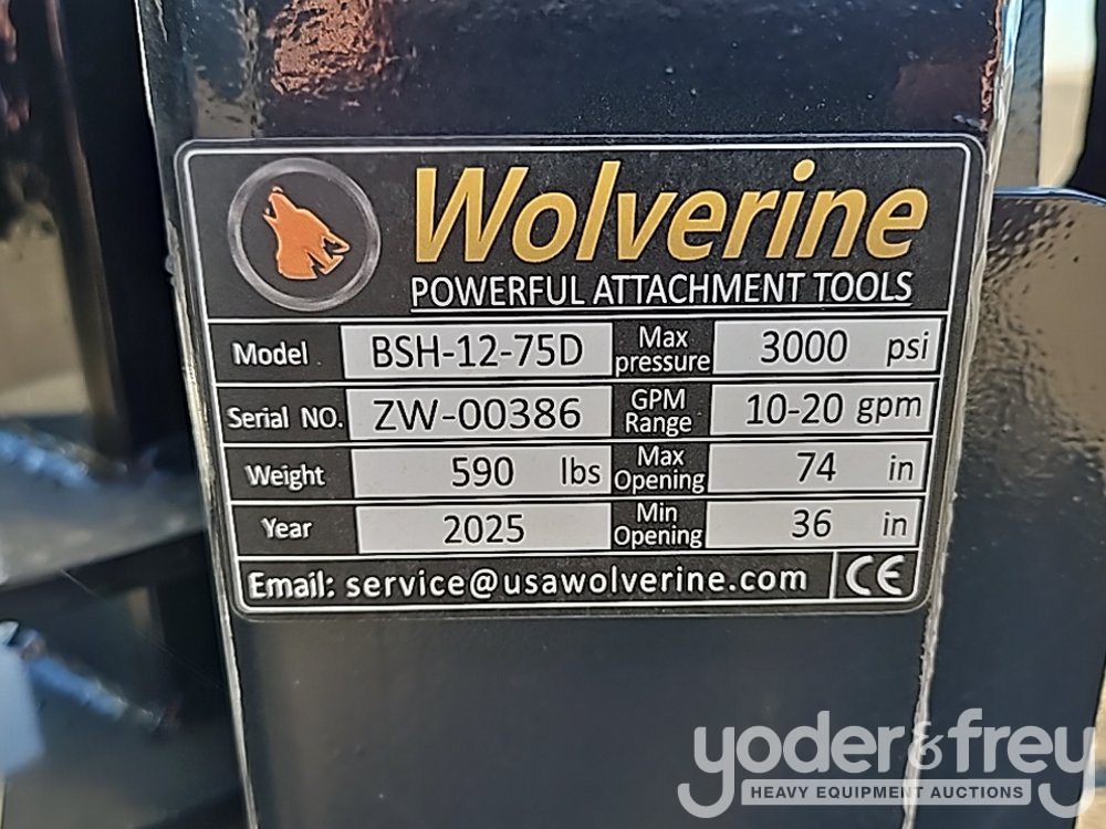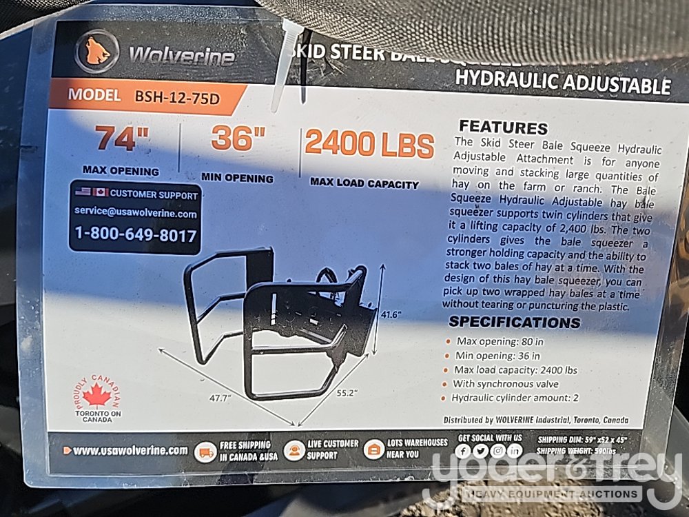Unused Wolverine BSH-12-75D Hydraulic Hay Bale Squeeze Clamp to suit Skidsteer - ZW00386