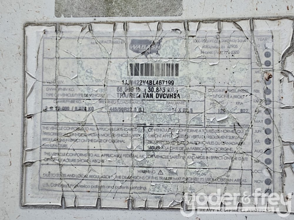 2011 Wabash 42' Tandem Axle Dry Van Trailer, 68,000lb GVWR - 1JJV422V4BL467199