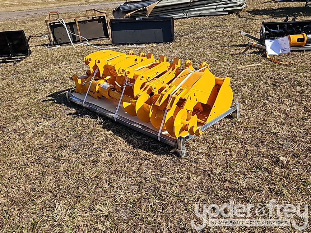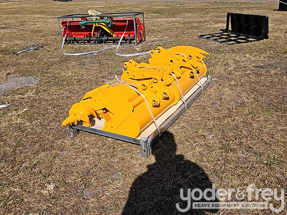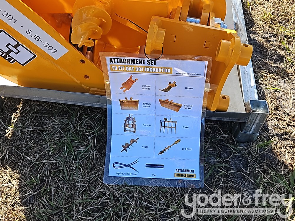 Unused GIYI QTY (8) Excavator Attachment Set, Rake, Ripper, Grabber, 12" Auger, 16" Auger, 8" Narrow Bucket; 24" Bucket, 32" Bucket to suit CAT 301