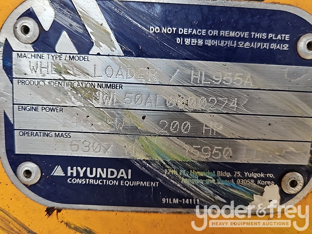 2022 Hyundai HL955A Wheel Loader, Cab, A/C, Auto Lube, Bucket, QC, Aux Hydraulics, Rear View Camera. (Meter Reading: 6369 Hours) - HHKHWL50AL0000274