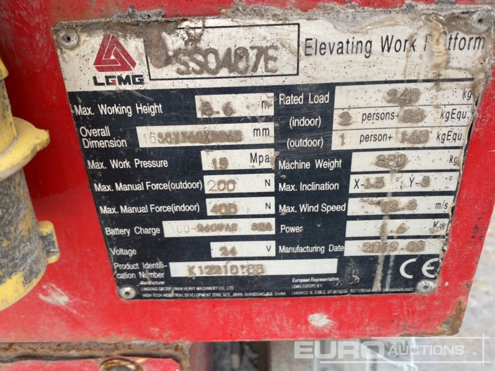 2019 LGMG SS0407 Electric Scissor Lift, 5.6m Working Height, 240kg Platform Capacity, Non Marking Tyres (Declaration of Conformity Available) - K12210188
