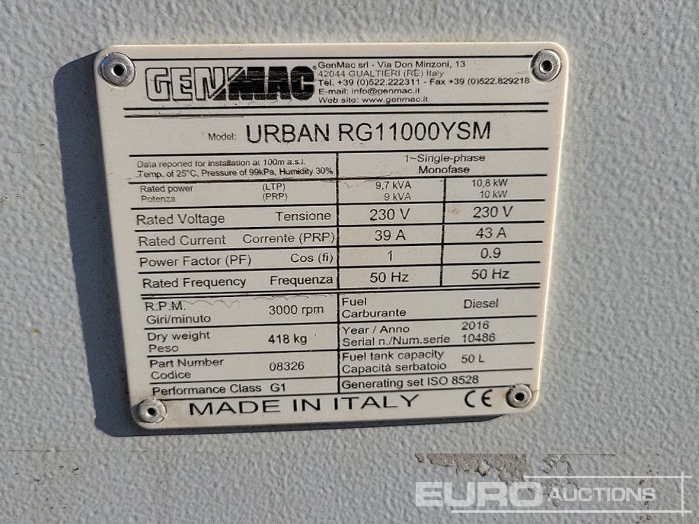 2016 Genmac URBAN RG11000YSM 9kVA Generator, 3 Cylinder Engine - 10486