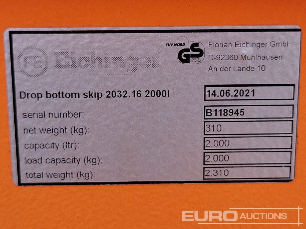 2021 Eichinger 2000LITRE Drop Bottom Skip to suit Forklift - B118945