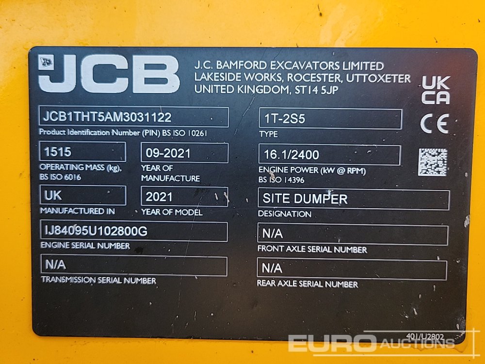 2021 JCB 1T-2S5 1 Ton Hi Tip Dumper, Roll Bar (Certificate of Conformity Available) (Meter Reading: 826 Hours) - JCB1THT5AM3031122
