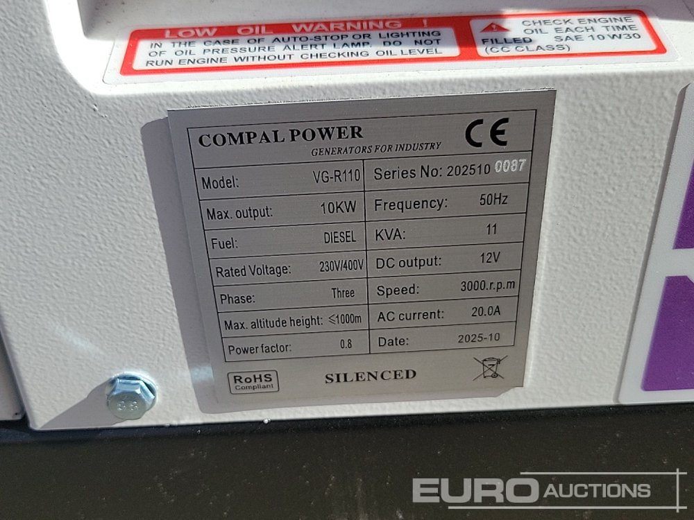 Unused 2025 Compal Power VG-R110 11kVA Generator, 1 Cylinder Engine - 2025100087
