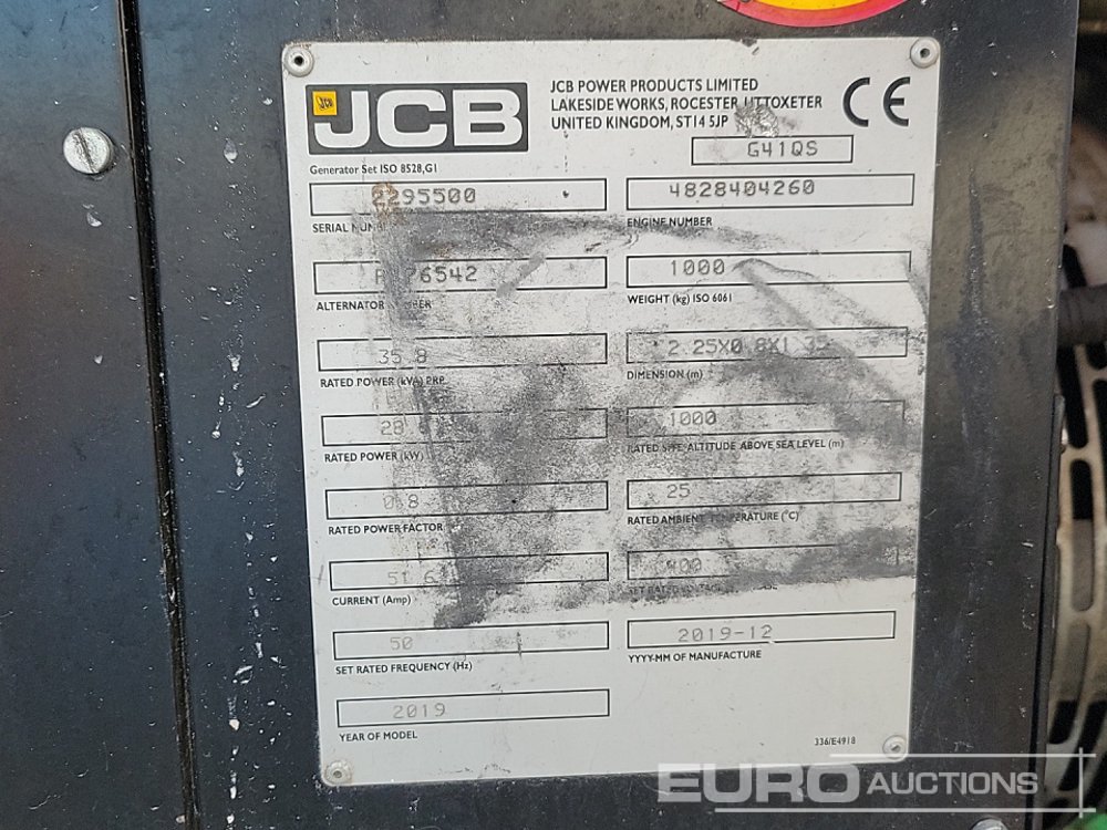 2019 JCB G41QS 35.8kVA Generator, Kohler Engine - 2295500