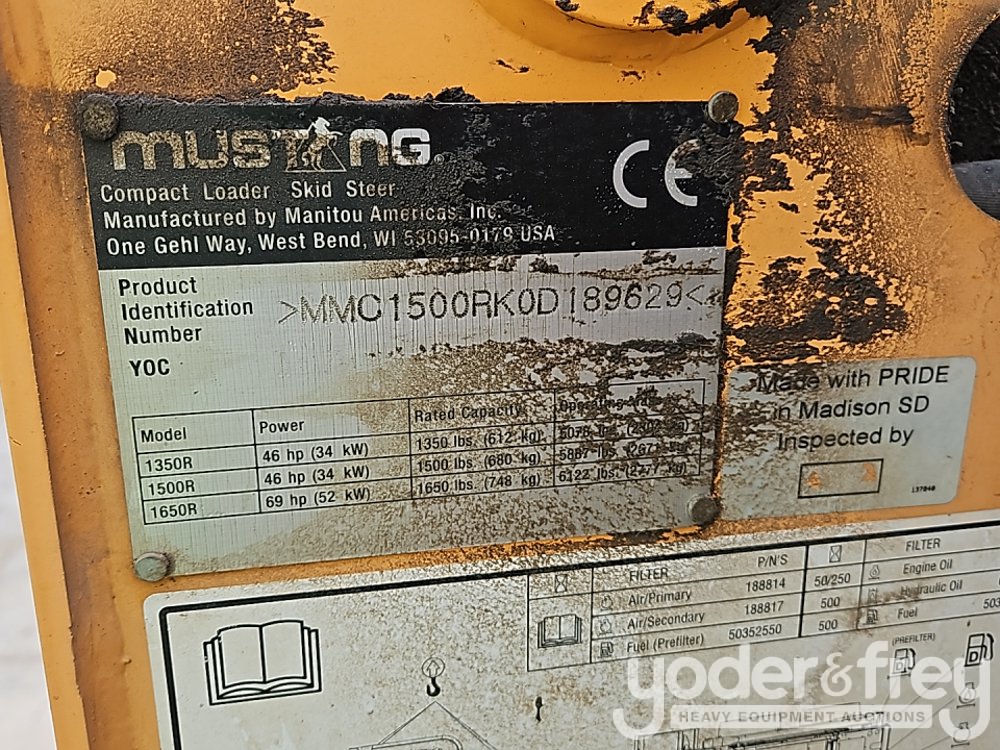 2015 Mustang 1500R Skidsteer Loader, OROPS, Solid Rubber Tires, Hand/Foot Controls, Bkt - MMC1500RK0189629